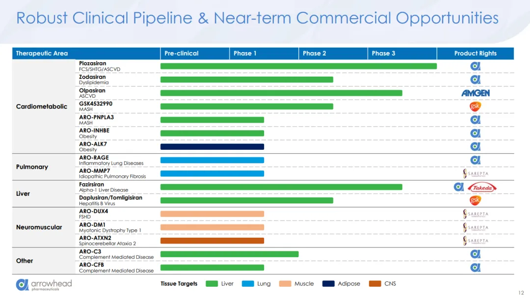 过去一年,对Arrowhead来说可谓动作频频。去年11月,该公司以8.25亿美元的首付款将多个临床和临床前siRNA项目授权给Sarepta,此外,根据患者招募情况和其他临床开发里程碑,还将分期支付高达100亿美元的款项。今年7月,Sarepta宣布进行战略重组,调整产品线,从传统的基因疗法转向这些新项目。随后,Sarepta的基因疗法Elevidys的安全问题爆发,Arrowhead的股价在一个月左右的时间里下跌了12%。