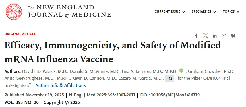 辉瑞(Pfizer)宣布,其首款 mRNA 四价流感疫苗(PF-07252220) 在三期临床试验中表现优于当前广泛使用的标准流感疫苗 Fluzone。这一关键结果已发表于本周的 《新英格兰医学杂志(NEJM)》,并被认为是 mRNA 技术在季节性流感领域迈出的重要一步。