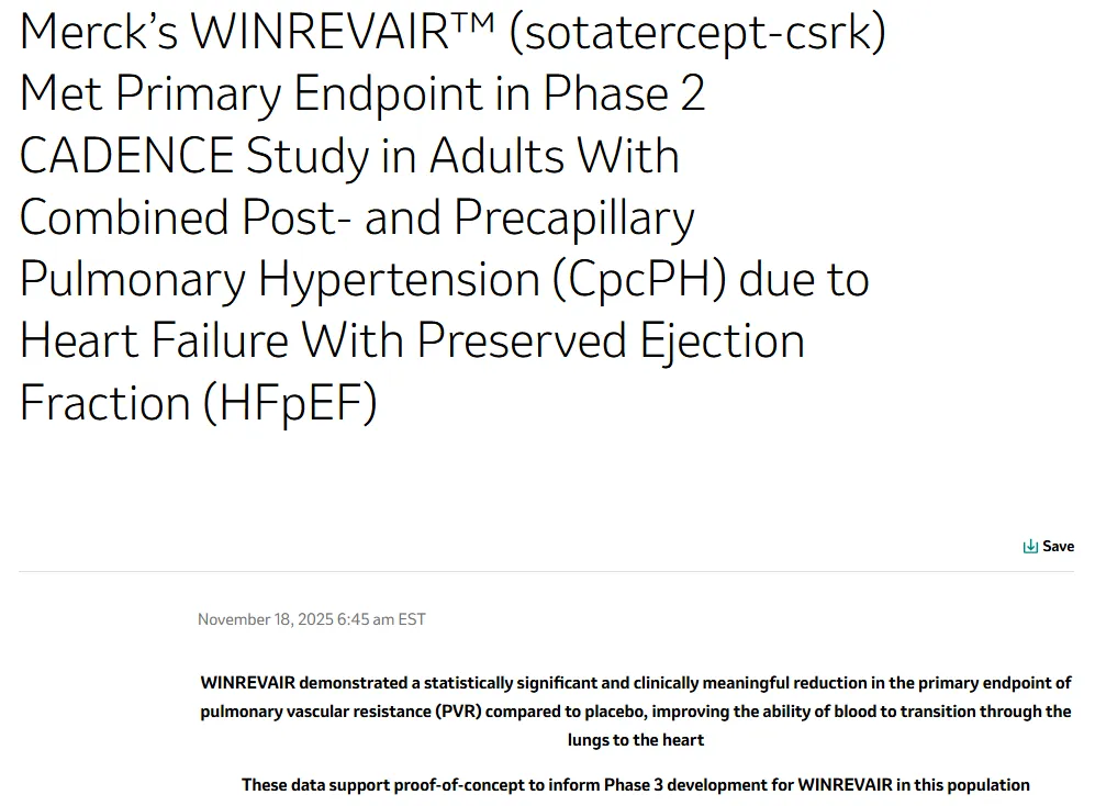 11月18日,默沙东公布了评估Winrevair(Sotatercept)用于治疗因射血分数保留的心力衰竭(HFpEF)引起的混合型毛细血管前后肺动脉高压(CpcPH)成年患者的II期CADENCE研究的积极结果。