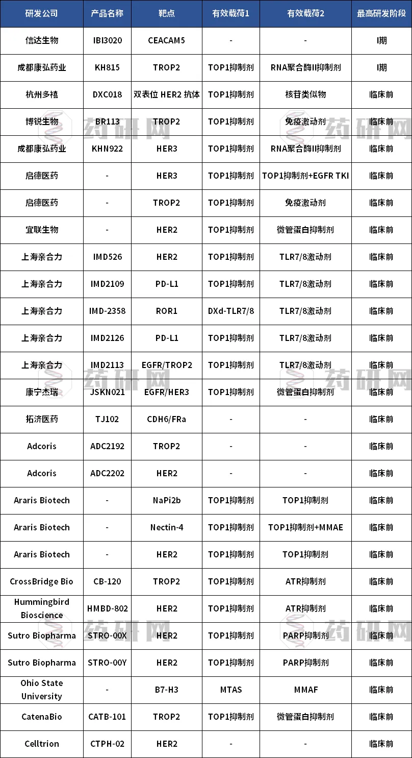 全球双有效载荷ADC管线盘点(药研网团队据公开数据不完全统计)