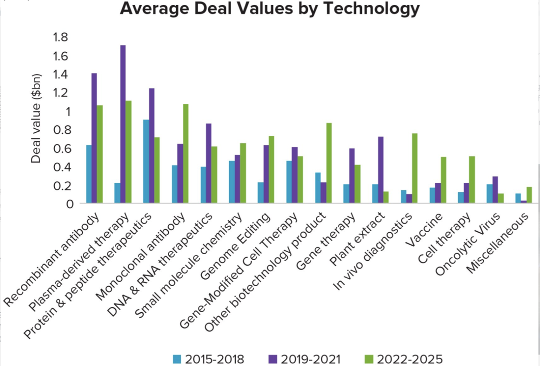 图1:按技术划分的平均交易价值(来源:Evaluate Pharma)
