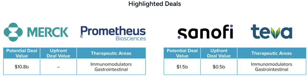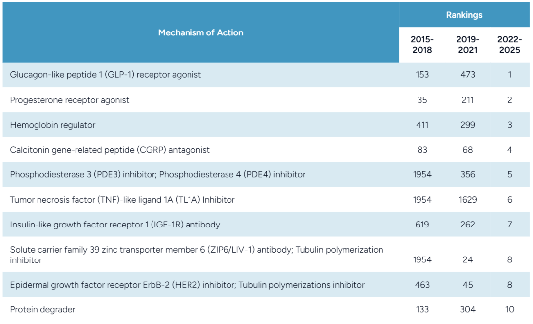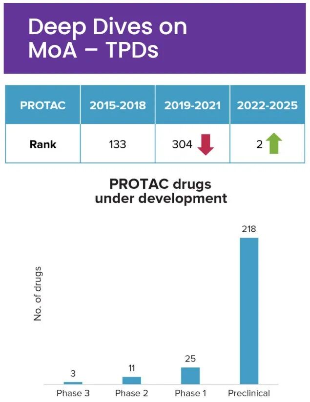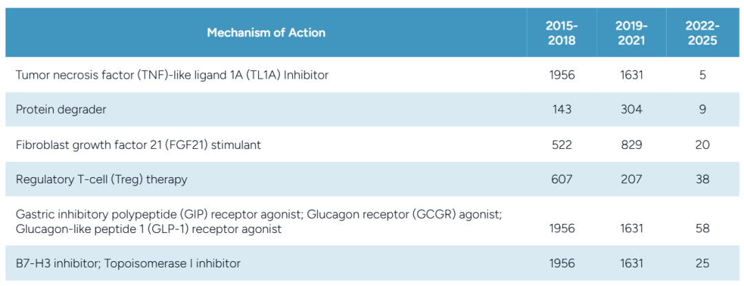 新兴作用机制(MoA)崭露头角:TL1A抑制剂、蛋白质降解剂和PDE3/4抑制剂在交易排名中迅速攀升,标志着从对症治疗向新型疾病修饰方法的转变。