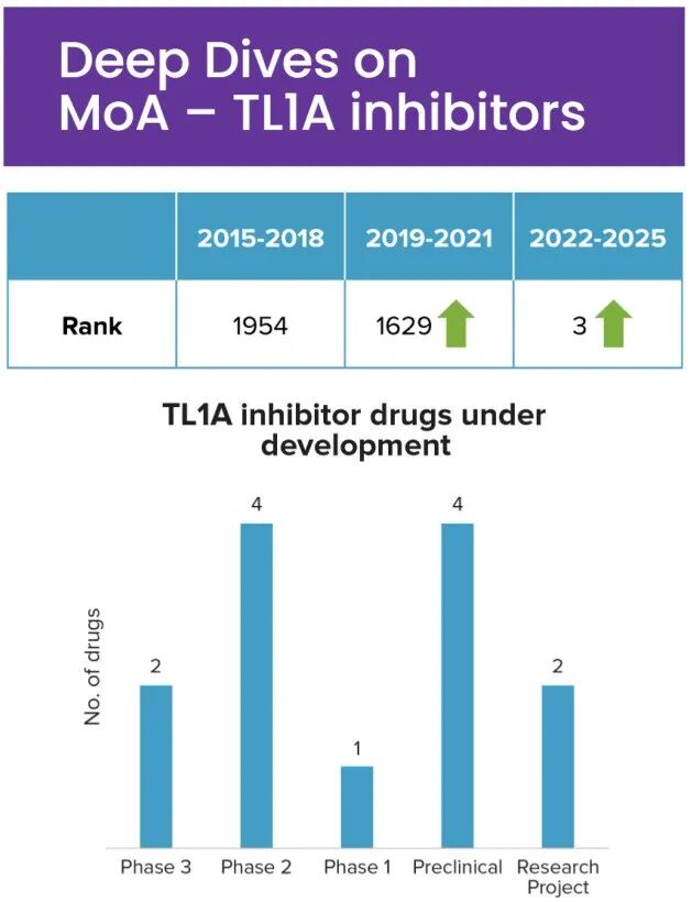新兴机制如TL1A抑制剂、蛋白酶抑制剂和PDE3/PDE4抑制剂也榜上有名。特别是TL1A抑制剂,从默默无闻到声名鹊起,反映了市场对胃肠疾病新方法日益增长的兴趣。