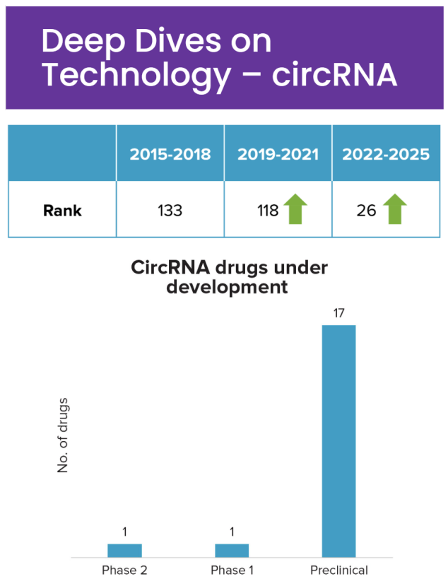 环状RNA(circRNA)的出现也格外引人注目,属Evaluate数据集中上升最快的新兴疗法之一。其是mRNA疫苗验证后推动的结果,该验证表明环状结构比线性mRNA具有更高的稳定性、更低的免疫原性和持续的蛋白质表达,预计首次临床批准将在2027年至2029年之间。