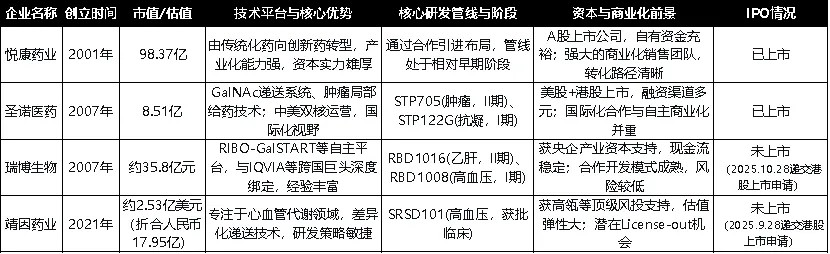 倘若说全球市场那广阔无垠的前景为所有参与者勾勒出了共同的机遇轮廓,那么各家企业自身所具备的内在特质与优势,便注定会引领它们走上截然不同的发展路径。接下来,我们将借助一组关键核心数据,对悦康药业、圣诺医药、瑞博生物以及靖因药业展开一场全方位、立体式的“实力透视”。这一系列数据背后所呈现的,恰恰是它们依据自身独特基因所做出的差异化战略选择与发展道路。