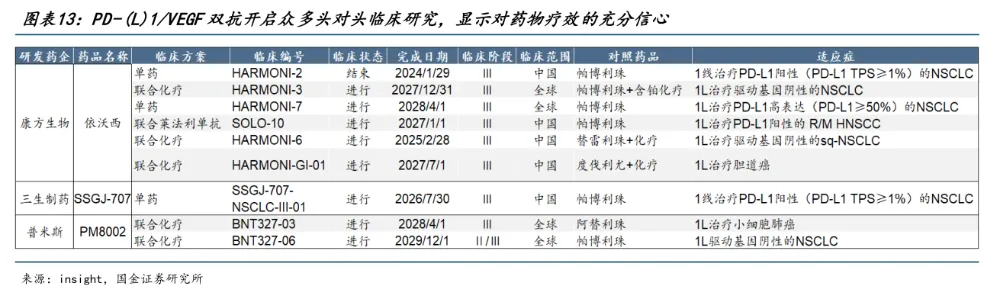 PD-(L)1/VEGF 双抗开启众多头对头临床研究/图片来源:国金证券研报