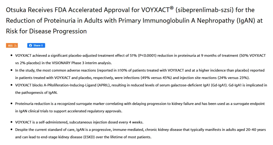 11月26日,大冢制药(Otsuka Pharmaceutical)宣布Sibeprenlimab(斯贝利单抗,英文商品名:Voyxact)获得FDA加速批准上市,用于治疗有疾病进展风险的原发性免疫球蛋白A肾病(IgAN),以减少蛋白尿。