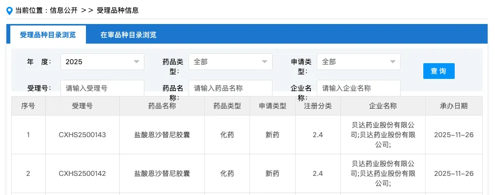 11 月 26 日,CDE 官网显示,贝达药业盐酸恩沙替尼胶囊新适应症上市申请获受理。根据临床试验进展,丁香园 Insight 数据库推测适应症为:间变性淋巴瘤激酶(ALK)阳性的非小细胞肺癌(NSCLC)术后辅助治疗。这是国内首个寻求将适应症拓展至术后人群的 ALK 抑制剂。