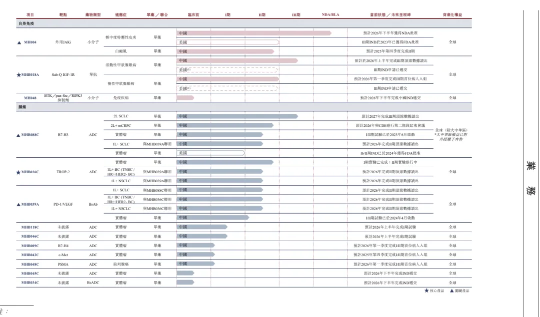 MHB036C处于临床II期,经过工程化改造,减少了非特异性摄取介导的潜在毒性。有临床前研究显示,与其他TROP2 ADC相比,MHB036C具有更强的肿瘤杀伤活性和良好的安全性;MHB018A主要用于治疗甲状腺眼病,作为皮下注射剂,较已上市静脉注射药物更具患者依从性优势。