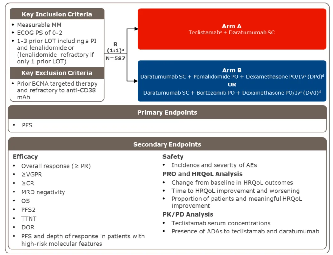 Majestec-3研究针对既往治疗线数1-3(即治疗线数2-4线)的RRMM患者,包含一种蛋白酶体抑制剂和来那度胺,本次入组将接受过靶向BCMA治疗和CD38难治患者排除在外,接受过一线治疗的患者须来那度胺耐药,允许患者接受过抗CD38治疗。研究入共入组587例患者,1:1随机分配到Tec-Dara组和DPd/DVd方案组,患者既往治疗线数为2(即3线RRMM患者)。值得一提的是,对照组DPd/DVd是当前RRMM公认的、指南推荐的核心常规三联治疗方案。