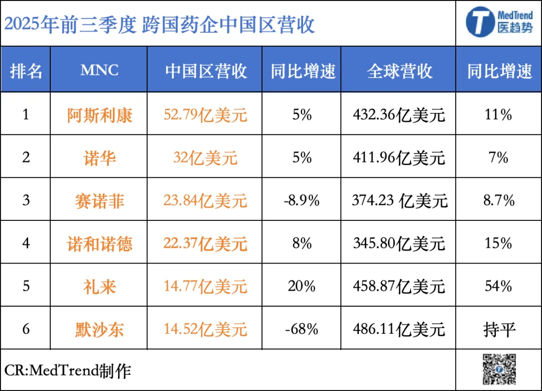 那些的MNC"优等生"阵营动荡,回望5年前,阿斯利康、默沙东、礼来、诺和诺德、诺华、赛诺菲6家MNC中国区营收增速高于全球增速,中国区成为核心驱动力量。进入2025年前三季度,目前6家MNC中国区增速均低于全球。