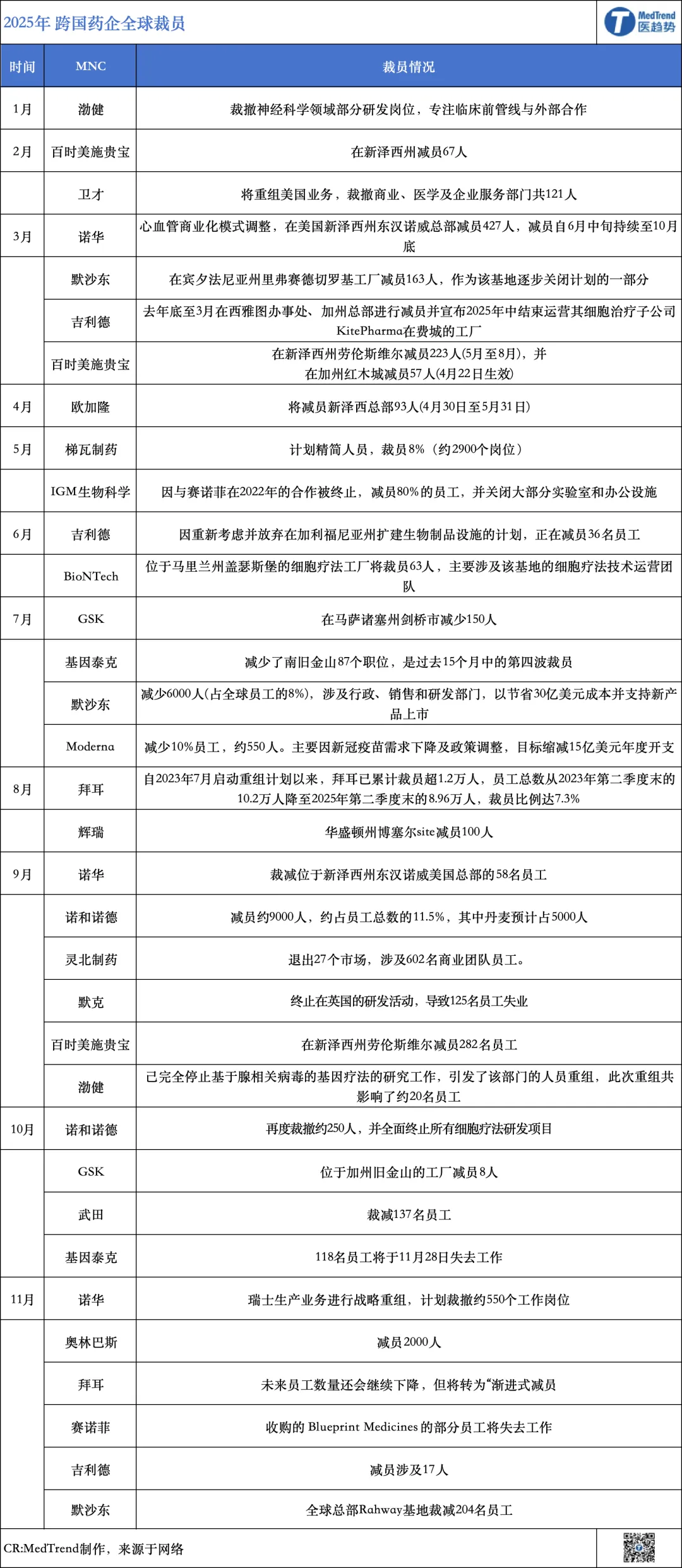先来看一些现实的场景:11月25日,诺华官宣两轮裁员,全球层面计划在瑞士总部裁减多达550个岗位;而在中国区,县域团队将整体调整,据悉涉及员工约500人。更早之前,11月18日,默沙东宣布其全球总部Rahway基地裁减204名员工。11月14日,赛诺菲表示将对今年6月收购的罕见病疗法公司Blueprint Medicines人员进行优化。11月12日,拜耳首席执行官比尔·安德森表示,第三季度公司员工数量减少1054人,环比降幅1%,未来员工数量还会继续下降。2025,一众跨国药企进入“瘦身”之年。