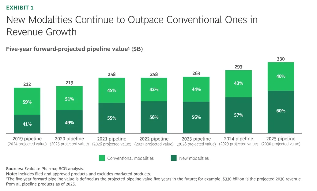 近期,波士顿咨询公司(BCG)发布最新报告《New Drug Modalities 2025》,该报告显示,2025年创新疗法(new modalities)在研发管线中的价值已达到 1,970 亿美元,相比去年快速增长17%,远超传统疗法,创下自2021年以来的最大增幅。