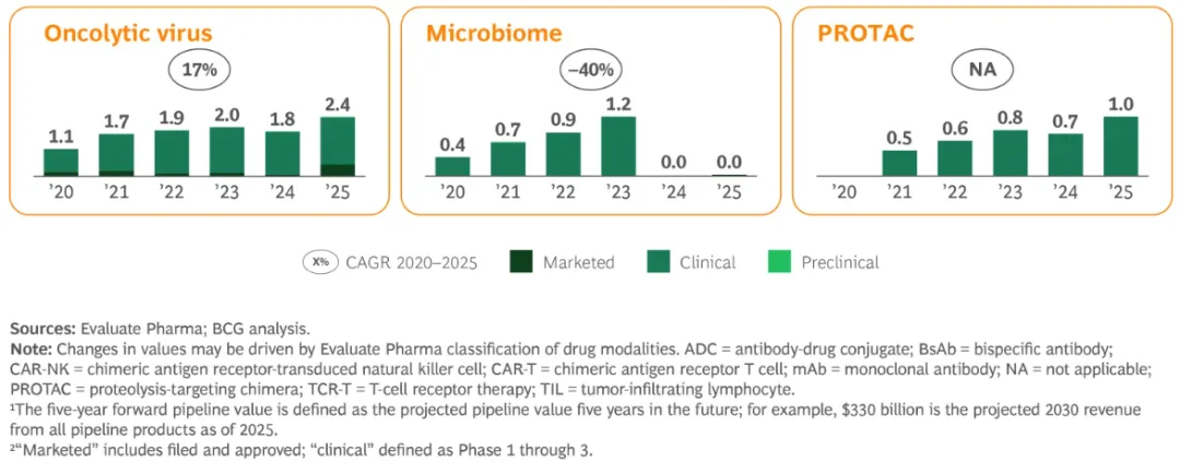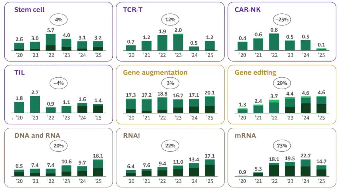 相较之下,部分新兴创新疗法(如基因疗法、mRNA 疗法和其他细胞疗法)增长放缓,进展较慢,面临受安全问题、临床挫折和商业化障碍的阻碍。