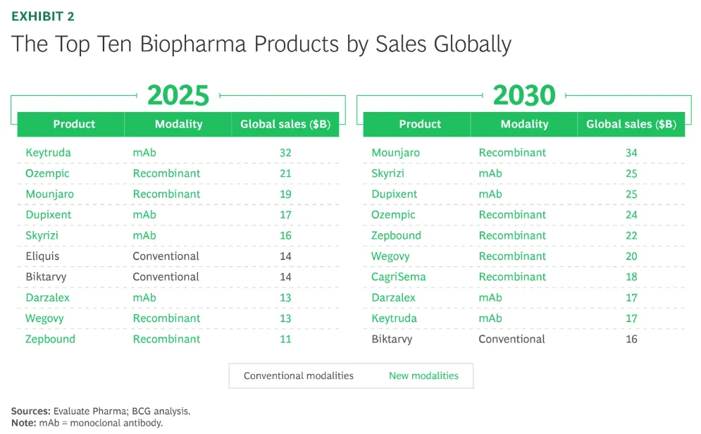 这三款重组蛋白制剂已取代传统药物SGLT‑2 抑制剂Jardiance(勃林格殷格翰与礼来联合研发)及两款单抗——强生的司妥昔单抗Stelara和BMS的纳武利尤单抗Opdivo。据预测,到2030年,销售额排名前十的药物中将有九款属于新型疗法,其中包括五款GLP-1激动剂,彻底重塑市场格局。