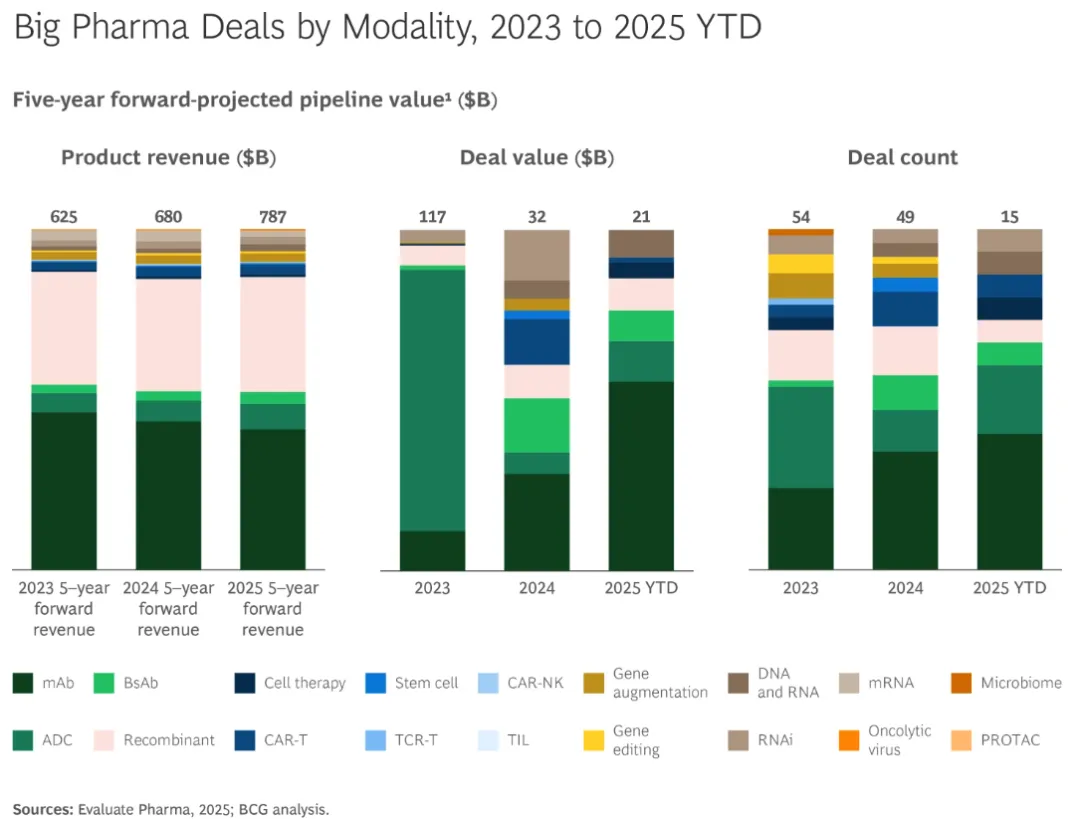 相比之下,其他模式(如重组技术、基因编辑、DNA/RNA)在 2025 年的交易活跃度下降,但仍有重大合作出现,如诺和诺德、礼来、诺华与多家创新公司达成合作,显示行业仍看好这些前沿技术的长期潜力。