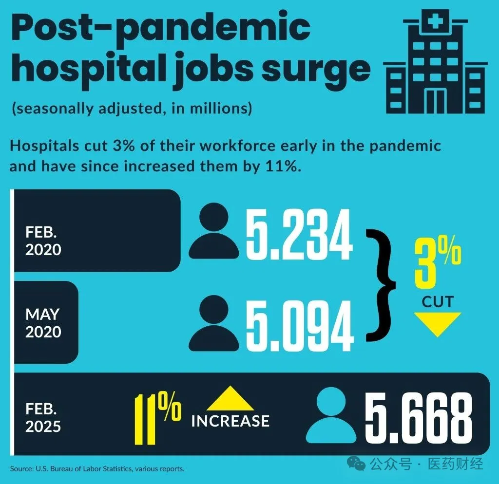 但随后迅速反弹,到2025年2月,医院就业人数已达566.2万人,较疫情低点增长11%,甚至比疫情前峰值高出8.3%。