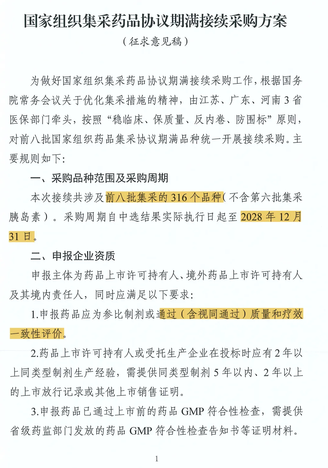 该方案由江苏、广东、河南3 省医保部门牵头,围绕“稳临床、保质量、反内卷、防围标” 原则,针对前八批国家组织药品集采(不含第六批胰岛素)协议期满的316 个品种开展统一接续采购,核心内容如下:
