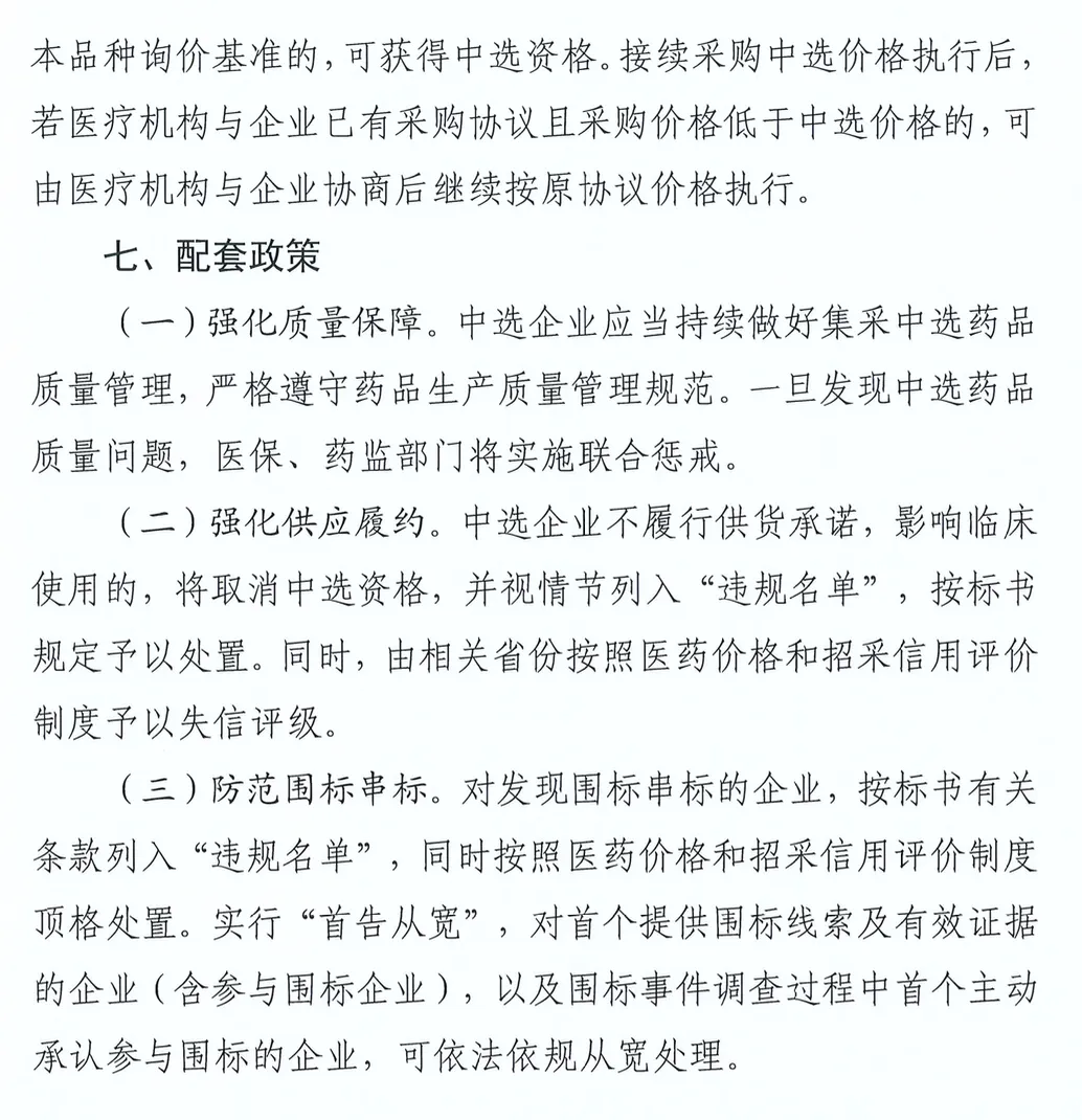 1.质量与供应保障:中选药品若出现质量问题,医保与药监联合惩戒;供应违约企业将被取消资格、列入“违规名单” 并失信评级,强化责任意识。