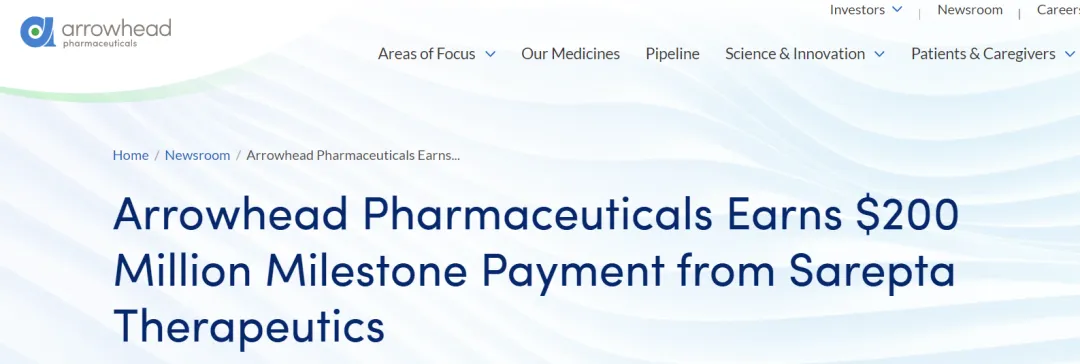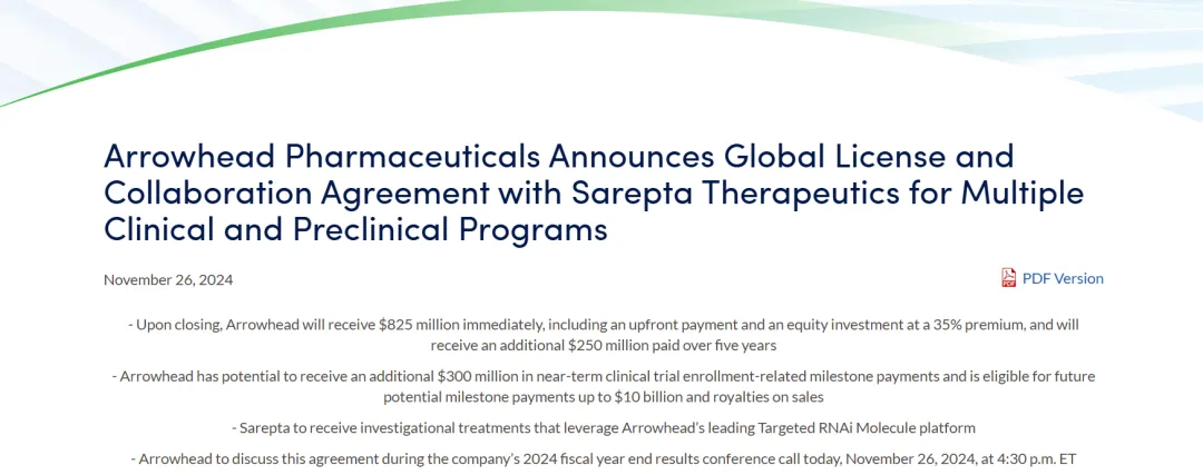 这项合作起始于2024年11月26日,当时Arrowhead Pharmaceuticals与Sarepta