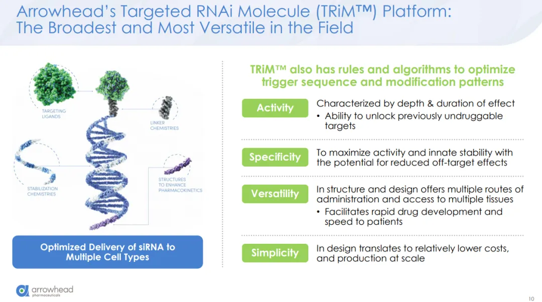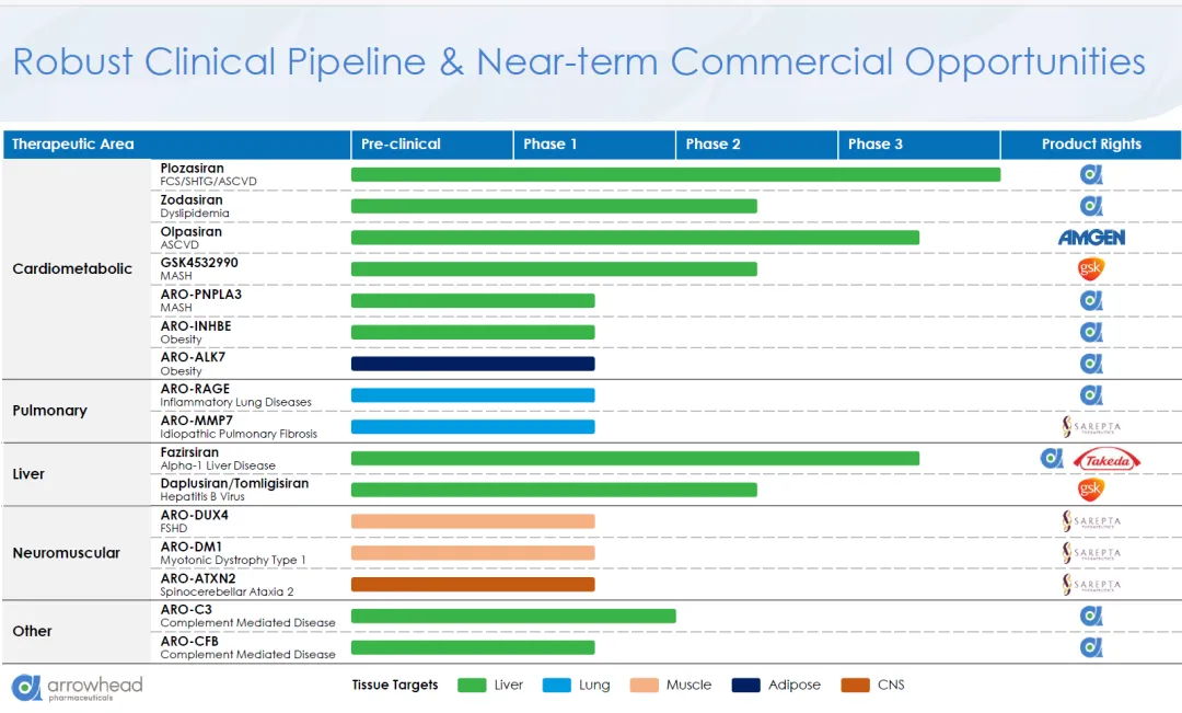 Arrowhead已经建立起丰富的研发管线,覆盖多个治疗领域,包括心血管代谢疾病、肺部疾病、肝病、神经肌肉和自免补体类。