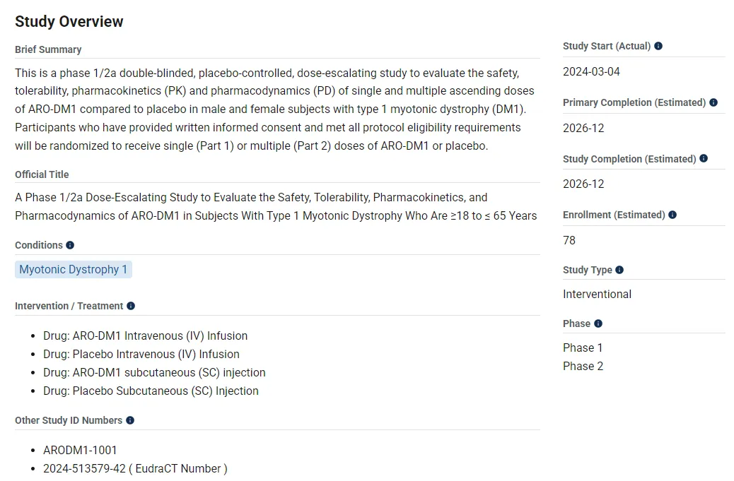 ARO-DM1正在进行一项1/2a期研究(NCT06138743),旨在评估其安全性、耐受性、药代动力学和药效学。