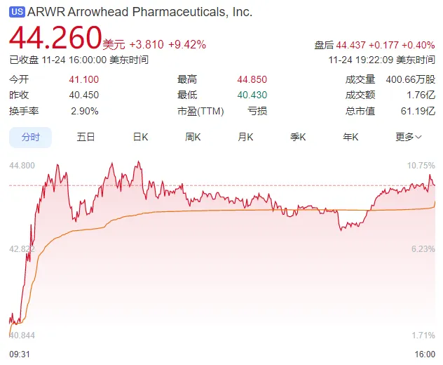 受此消息影响,Arrowhead股价上涨9%,报44.26美元/股。