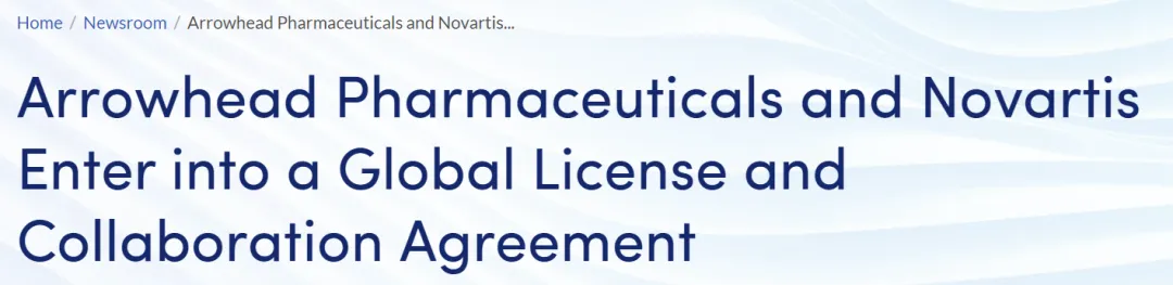 Pharmaceuticals宣布将临床前阶段的ARO-SNCA授权给诺华,用于治疗核突触蛋白相关疾病如帕金森病等,此外,诺华还活的TRiM技术平台的授权,诺华支付2亿美元预付款,20亿美元里程碑金额以及一定比例的销售分成。
