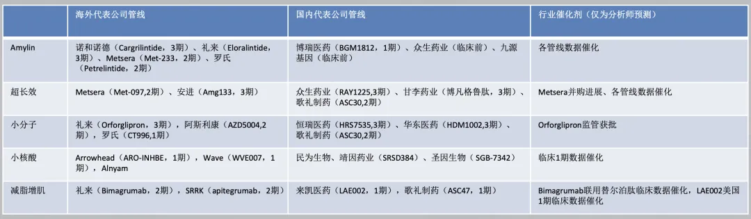 下一代减肥药研发方向和相关临床催化剂(括号内为全球最高进度) 数据来源:医药魔方,国泰海通证券研究