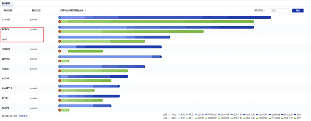 在这样的临床需求驱动下,全球制药企业纷纷将研发重心投向新型降脂靶点。根据药智数据库,当前全球心血管药物研发管线中,PCSK9与Lp(a)已成为制药企业布局的两大重点靶点。跨国药企如礼来、诺华、默克等均在积极推进针对这两大靶点的药物,一场围绕新型降脂靶点的研发竞赛已然拉开序幕。