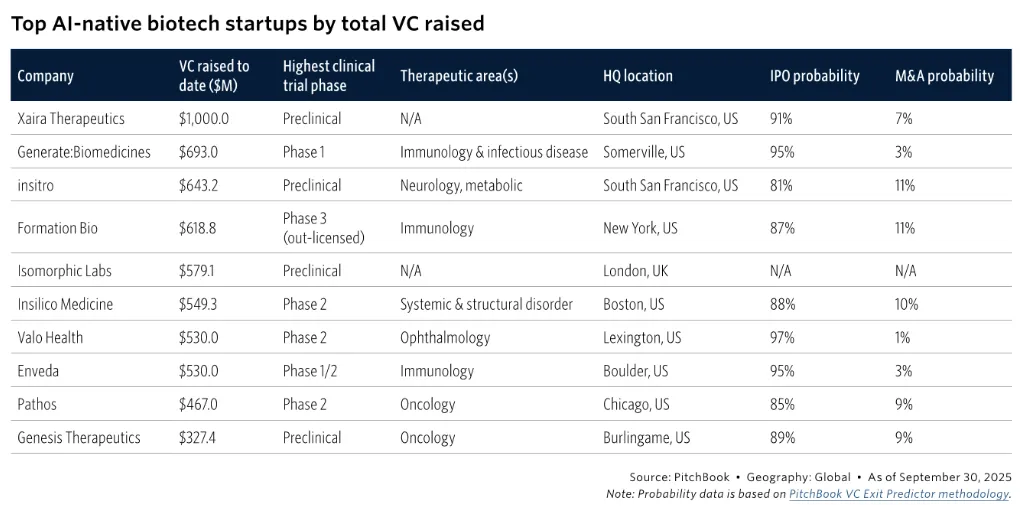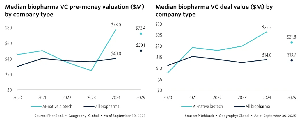 根据PitchBook最新发布的行研报告,从创立之初即全面引入AI技术的药企,其估值较传统创新药企高出近100%。以2024年数据为例,AI药企的中位估值达到7800万美元,而行业平均中位估值为4000万美元。