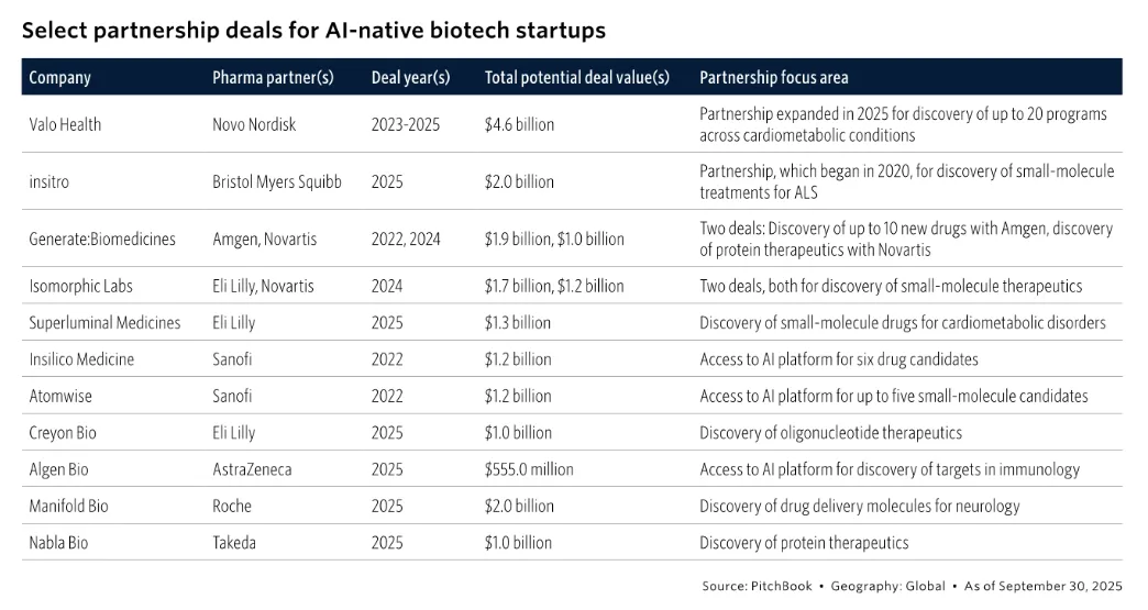 全球十大制药巨头(MNC)更是无一缺席。以万亿美元市值的礼来为例,(不完全统计)仅2025年内礼来就进行了十次对外的AI制药领域合作,合作方中也不乏英伟达、OpenAI等AI领域龙头。其中大单笔AI制药合作总价值高达13亿美元,合作方是专注于专注于G蛋白偶联受体的AI制药公司Superluminal Medicines,涉及领域则是礼来最擅长的心血管代谢疾病和肥胖领域。