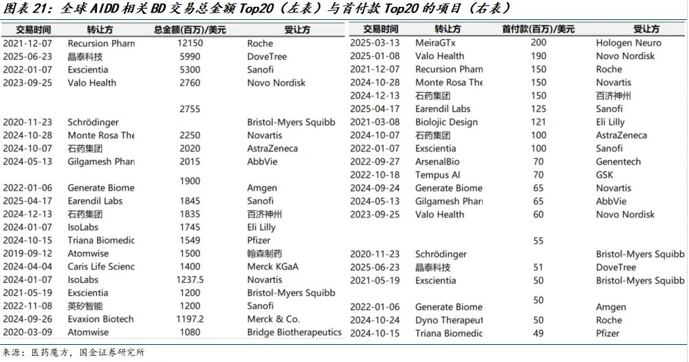 下表为,全球AIDD相关交易首付额和总额Top 20的项目。可以发现大交易集中发生在近5年内,总额超过500亿美元。