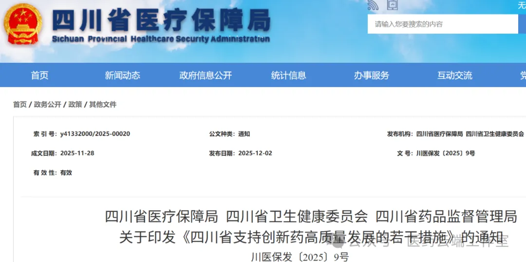 12月2日,四川省医保局、省卫健委、省药监局三部门印发《四川省支持创新药高质量发展的若干措施》的通知,提出了该省支持创新药高质量发展的13条措施。