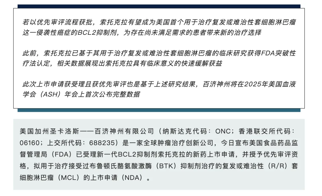 长江后浪推前浪,百济神州显然不会想留在沙滩上,索托克拉是百济挥出的“第一剑”。作为新一代BCL-2抑制剂,FDA已受理索托克拉MCL适应症上市申请并授予优先审评资格;NMPA也受理了MCL及CLL/SLL双适应症申请并纳入优先审评。