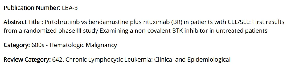 12月6日-9日的2025美国血液学会(ASH)年会上,礼来将公开两项III期临床数据,包括头对头比较Pirtobrutinib与Ibrutinib(伊布替尼)的BRUIN CLL-314研究和头对头比较Pirtobrutinib与传统化疗方案的BRUIN CLL-313研究结果,后者更入选ASH年会最新突破性研究摘要(Late-Breaking Abstracts,LBA)之一。