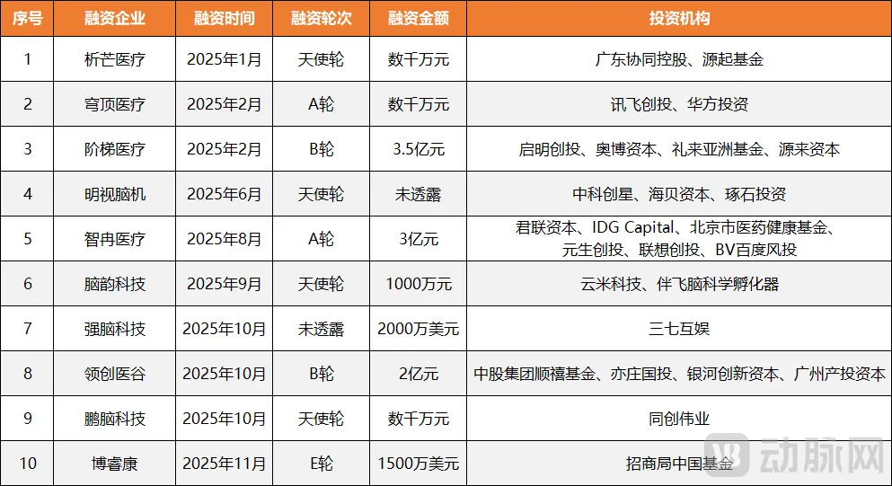 图2.2025年1-11月国内脑机接口代表性融资事件(数据来源:动脉橙)