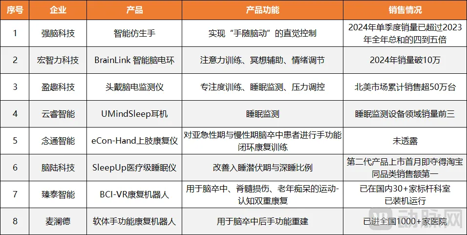 以强脑科技推出的智能仿生手为例,这是国内最早走向市场的非侵入式脑机接口产品之一,于2020年正式推出并实现量产。根据最新数据显示,智能仿生手2024年单季度销量已超过2023年全年总和的四到五倍,正处于市场快速扩张阶段,其市场定价为3-5万元,按此测算,智能仿生手至少为强脑科技带来了千万元级别的收入。另外,除了智能仿生手,强脑科技还拥有深海豚(Easleep)脑机智能安睡仪、FocusZen(舒压/专注力)脑环等多款产品,并且当前都已获得不错的市场收入。