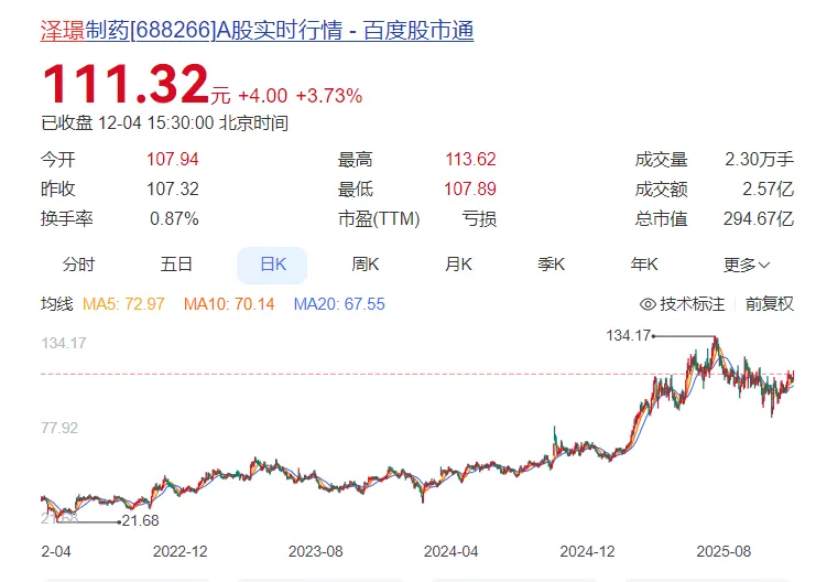 自2022年资本寒冬以来,整个行业面愁云密布。然而,泽璟制药涨幅却超400%,从2022年20元/股的低谷攀升至2025年134.17元/股的峰值,当前稳定在110元左右。市净率显著高于行业平均,市值也翻了好几番,甚至已经超过了君实、再鼎、诺诚健华等营收规模大了好几倍的港股上市药企。