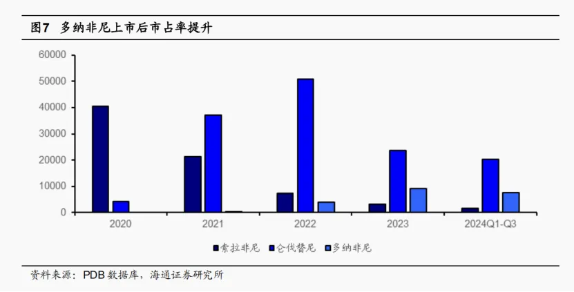 与索拉非尼、仑伐替尼相比,凭借安全性更优,且进入医保后价格优势显著,多纳非尼上市后销售额攀升明显。截至2024年底,多纳非尼已进入医院 1100 余家、覆盖医院 2000 余家、覆盖药房近1000家,销售持续放量。而2024年之所以营收涨幅超30%,便得益于多纳非尼片的销量增加。