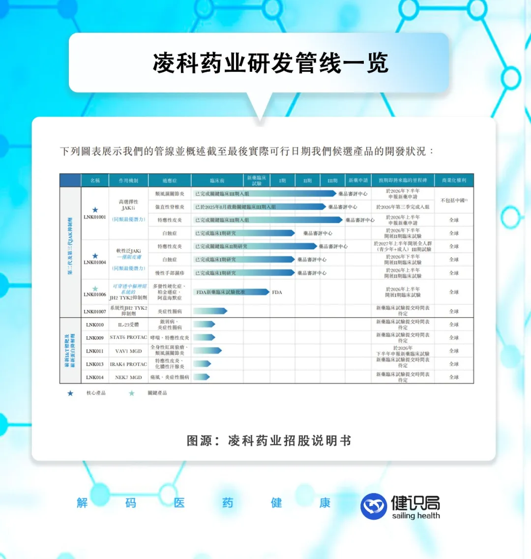 JAK抑制剂是近年来自免药物领域的大热门。因其可作用通路与很多疾病的发生相关,可想像的市场空间广阔。JAK抑制剂因此被视作是“新一代的自免药王”。根据招股书,凌科的LNK01001是进度最快的品种,用于特应性皮炎、类风湿关节炎、强制性脊柱炎均处于三期临床试验,最快2026年上半年提交用于特应性皮炎治疗的新药上市申请。