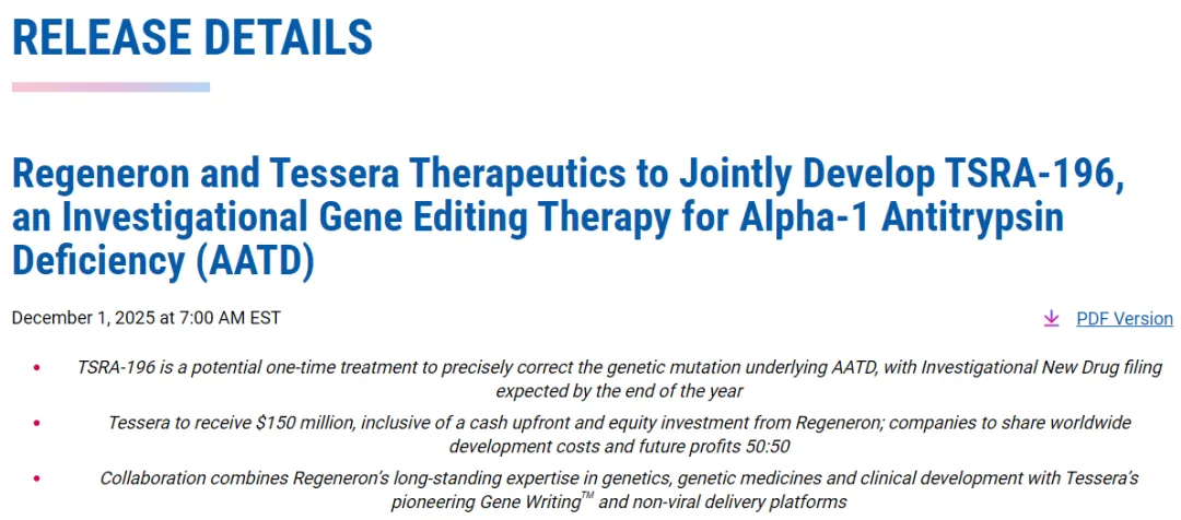 12月1日,再生元(Regeneron)与Tessera Therapeutics共同宣布达成全球合作,双方将联合开发并商业化用于治疗α-1抗胰蛋白酶缺乏症(AATD)的基因编辑疗法TSRA-196。