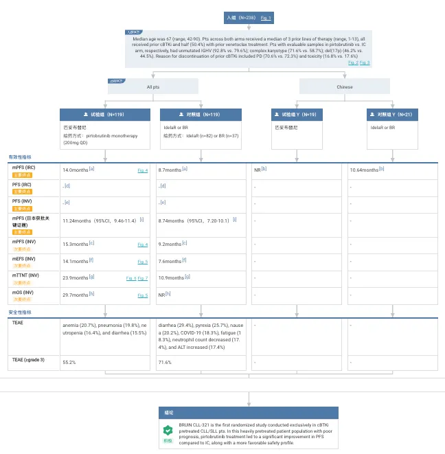 此次批准基于 BRUIN CLL-321 研究的结果。这是一项随机、开放标签的 III 期研究,共入组 238 名受试者,随机分组接受匹妥布替尼和研究者选择的 IdelaR(艾代拉利司+利妥昔单抗) 或 BR(苯达莫司汀+利妥昔单抗)治疗。主要终点是 IRC 评估的 PFS。结果显示,PFS 风险比(HR)为 0.54,匹妥布替尼组的中位 PFS 为 14 个月,对照组为 8.7 个月。