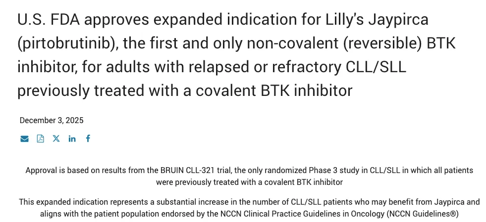 当地时间 12 月 3 日,礼来宣布,美国 FDA 已批准 Jaypirca(Pirtobrutinib,匹妥布替尼,100mg 和 50mg 片剂)用于治疗既往接受过共价 BTK 抑制剂治疗的复发或难治性慢性淋巴细胞白血病或小淋巴细胞淋巴瘤(CLL/SLL)成人患者。