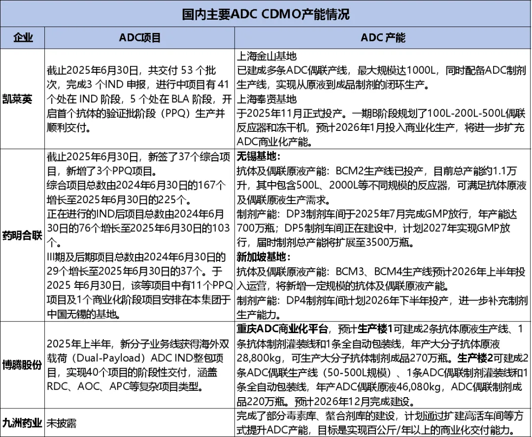 从产能情况来看,药明合联无锡基地目前抗体及偶联原液产能总产能约1.1万升,制剂总产能将计划在2027年扩展至3500万瓶。新加坡基地预计于2026你拿上半年投入投入运营。制剂方面也将在26年下半年进一步补充产能。其具备全链条一体化能力,是ADC CDMO领域“全能型选手”。
