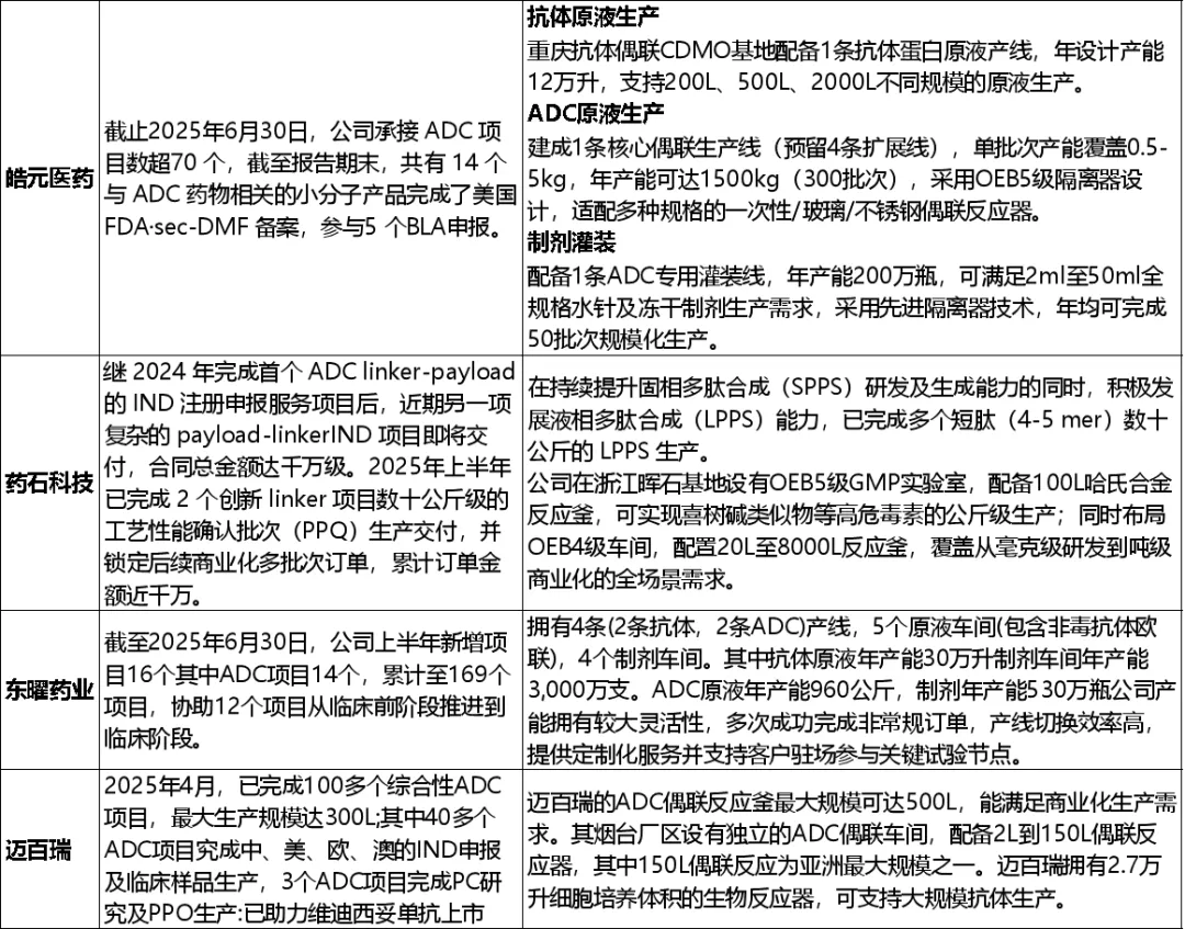 皓元医药ADC项目超70个,FDA DMF备案14项,具备从毒素到制剂的完整能力。重庆基地原液产能高达12万升,偶联年产能1500kg,灌装200万瓶/年,属“高配置垂直整合型”。ADC原液年产能可达1500kg,重庆抗体偶联CDMO基地配备1条抗体蛋白原液产线,年设计产能12万升。