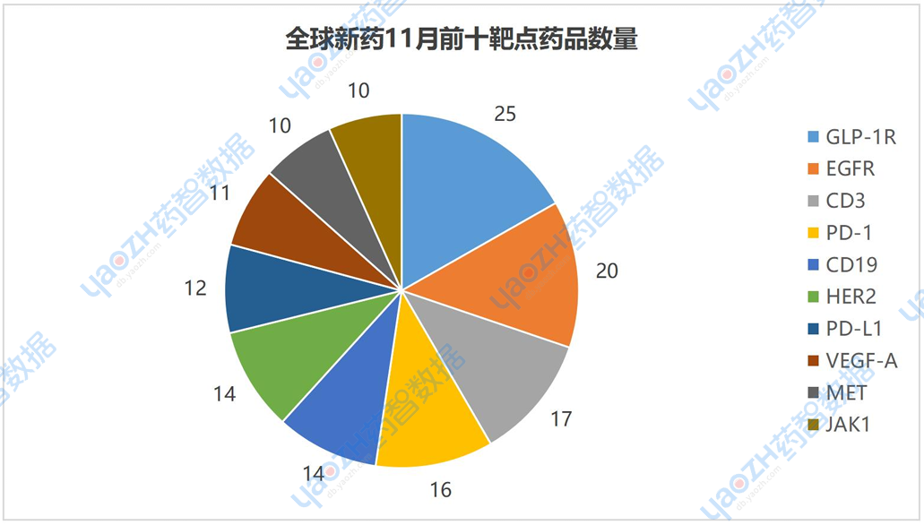 11月有更新动态的831个项目中,涉及最多的靶点是GLP-1R,其次是EGFR和CD3。以下是排名前十的靶点,图中仅展示药品数量,具体内容可通过全球药物分析系统进行查看。