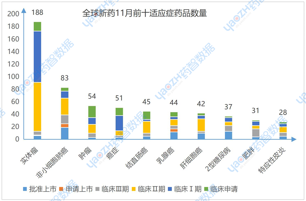 11月有更新动态的831个项目中,涉及最多的适应症是实体瘤,其次是非小细胞肺癌和肿瘤。以下是排名前十的适应症及其全球最高研发阶段情况,图中仅展示药品数量,具体内容可通过全球药物分析系统进行查看。