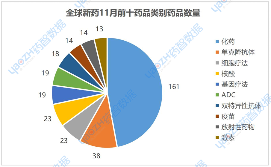 11月有最新进展的344个药品中,药品类别占比前三的分别是化药47%,单克隆抗体11%,细胞疗法7%。图中仅展示前十药品数量,具体内容通过全球药物分析系统进行查看。