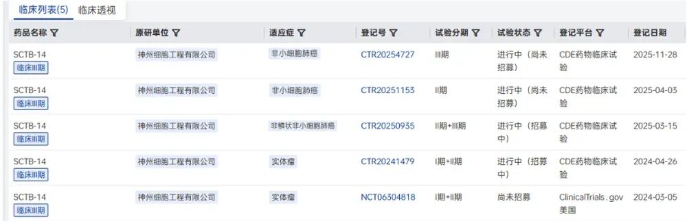2025年11月28日,神州细胞工程有限公司在药物临床试验登记与信息公示平台登记了一项评估SCTB14对比帕博利珠单抗一线治疗驱动基因阴性、TPS≥10%的局部晚期或转移性非小细胞肺癌的有效性和安全性的随机、双盲、多中心的Ⅲ期临床研究(登记号:CTR20254727)。